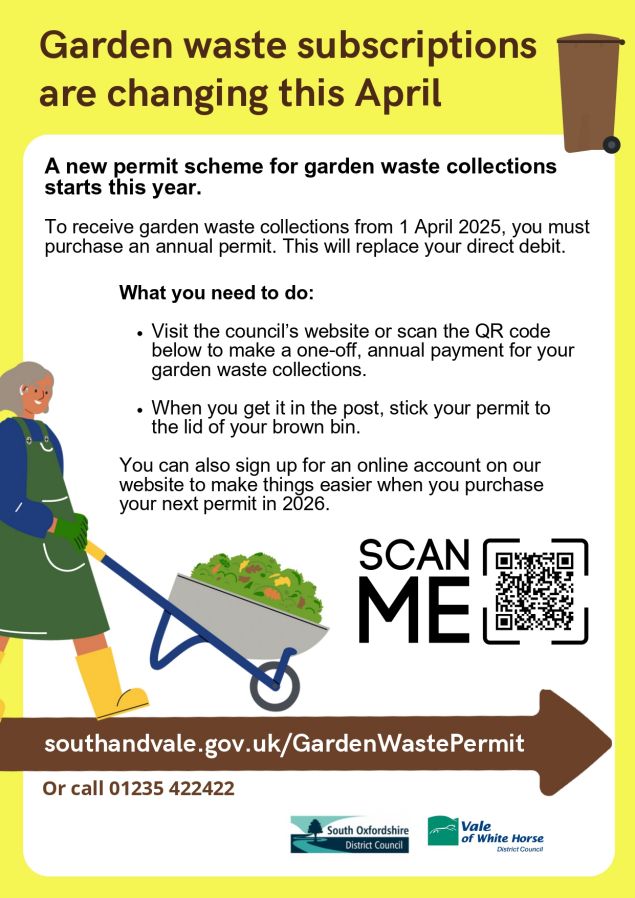 See the flyer below. The new payment system is available online at www.southoxon.gov.uk/gardenwaste.