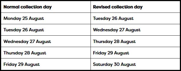 Residents are reminded that, owing to the Summer Bank Holiday, this week’s waste and recycling bin collections will be a day later than usual.